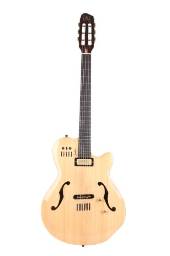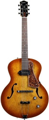 Other features include a smooth sounding floating Godin Mini-humbucker jazz pickup in the neck, ebony fingerboard, ebony volume and tone knobs, classic multi-layered binding, high-ratio open geared nickel tuners, engraved floating pickguard, custom tailpiece and adjustable Tusq bridge by Graphtech.